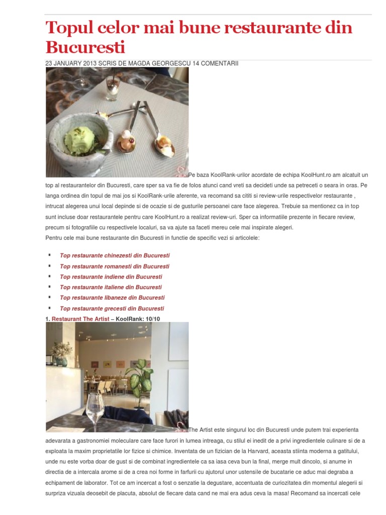 Am luat in calcul restaurantele japoneze generaliste, pentru ca sushi are deja o categorie separata. In bucuresti mancarea e buna, dar difera serviciul, depinde si de chelneri dar in. Restaurante de top recomandate pentru turisti din bucuresti | vezi meniul si recenziile si rezerva online o masa prin cerestaurant.ro ca sa nu dai gres!